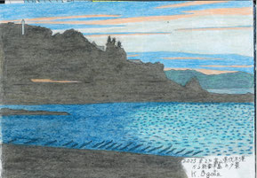 写真と違い風景中の個々の部分でなく光を受けた広がりと全体感ある自然風景をスケッチしています。