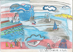 確定した段階で鉛筆の線や事前に引いたタテヨコの線(雲の線以外)を消しゴム(大小2本)で消し、水性ペンと色鉛筆で色を付けていきます。